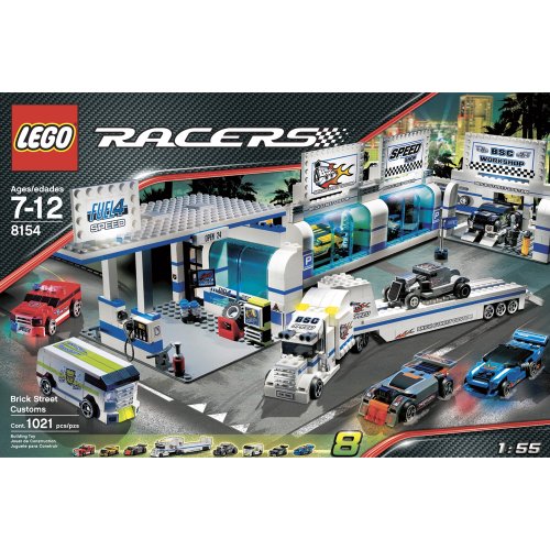 Get your LEGO Racers tuned up and ready to drive at the Brick Street Customs racing garage. It's got everything you need, from the working car lift to the fill-up station, plus a tuner shop full of extra parts for your racers. Gas station has a drink machine, gas pumps, tire and oil cans. Work shop includes working car lift to inspect the car, spare tires, engine and more. Includes 7 tiny turbo racers and a flatbed transport truck with car-carrying trailer. Tractor trailer measures 13" long. Racers measure 3" long. 1,021 pieces.