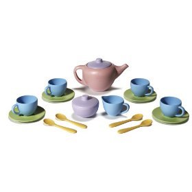 Teach your daughters to care for Mother Earth with this "green" make-believe tea set with four place settings. Includes 17 pieces: one pink teapot with purple lid, one purple sugar bowl and lid, one blue creamer, four blue teacups, four green saucers, and four yellow teaspoons. Made in the USA from recycled milk jugs.