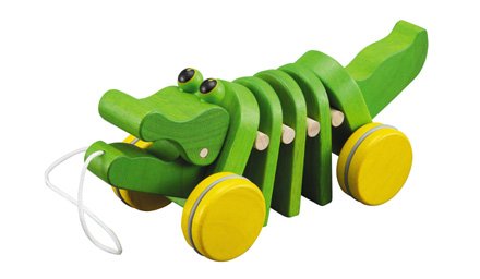 PLAN TOYS Dancing Alligator   A pull toy designed in an alligator-like shape. While being pulled, the wooden pieces make rhythmic Click-Clack sounds. Toddlers can pull it along on a two-foot leash while learning to walk.   Measures approx. 3.75" x 9.75" x