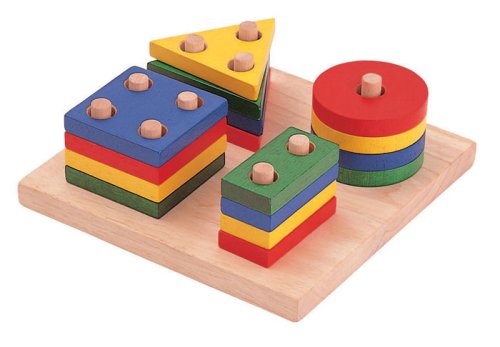 Children are endlessly taking things apart and putting them together, only to pull them apart again. This ageless game is capitalized upon by the award-winning Geometric Sorting Board. It focuses on attention-getting, easily grasped shapes that come in four colors. The challenge is to find which shape fits on which set of pegs. The circles have one hole, the rectangles two, the triangles three, and the squares four. They are perfectly sized to fit on a finger, too. Making different color patterns, counting, or stating the color before putting it on the 7-inch square wood base adds interest as your child develops a skill. Note: Winner of the Good Toy Award from Parent magazine. --Lynne Sampson