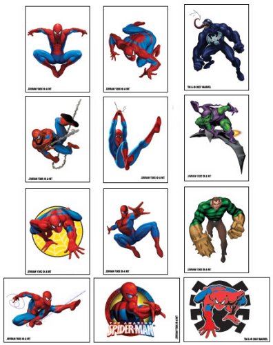 Spiderman Temporary Tattoo Set. These licened temporary tattoos are made for vending machines. Like a gumball, fans would place two quarters into a vending machine, turn the knob and get one random Spiderman tattoo. We have removed the risk by place the complete set of 12 together in one lot. The graphics are small, just a little bigger than a quarter and each comes on it own sheet. Easy to apply. Directions are on the back of each tattoo. Warning: Do not apply on sensitive skin or near eyes.